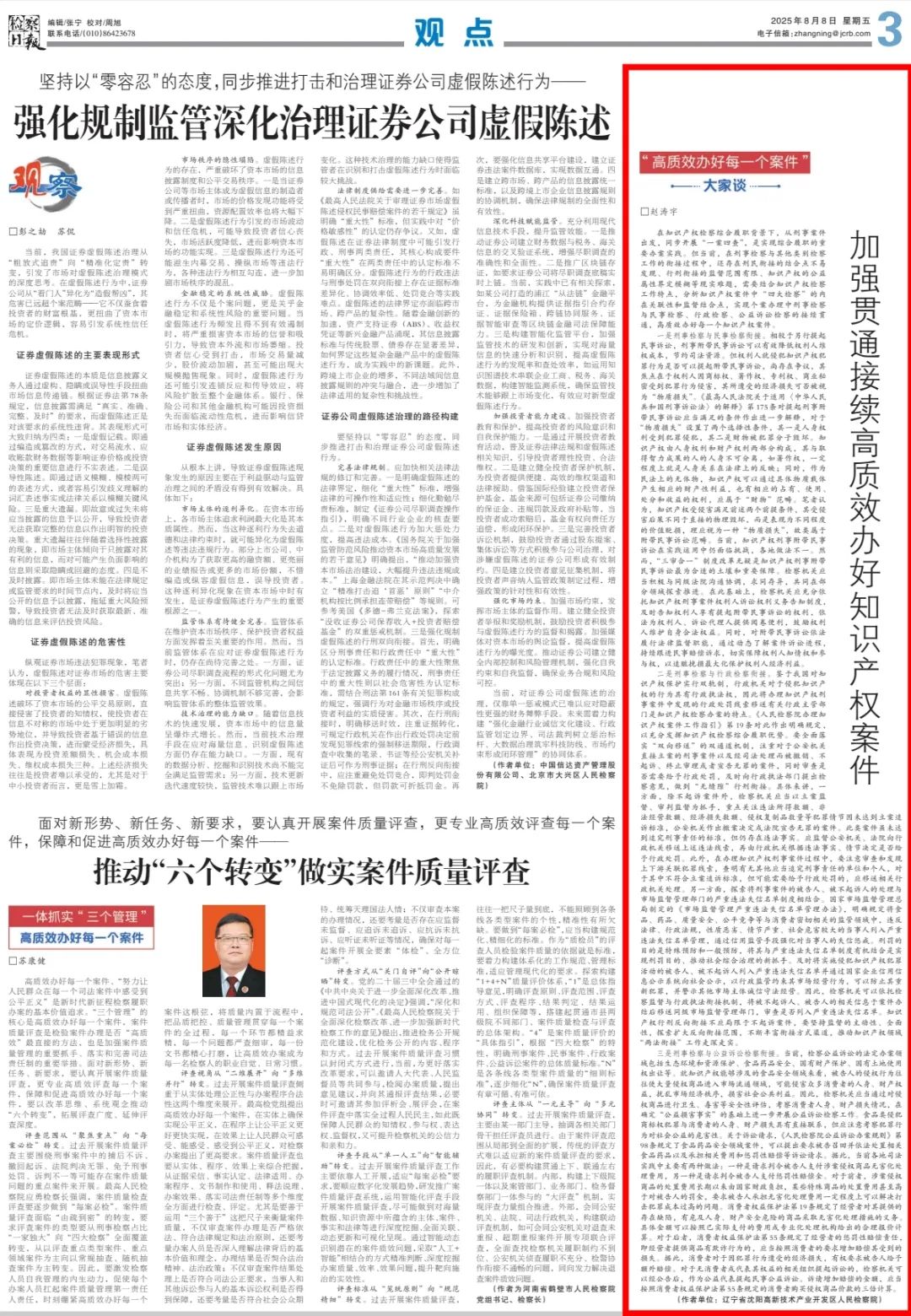 8月8日《检察日报》三版刊发我院第二检察部主任赵涛宇的理论文章《加强贯通接续高质效办好知识产权案件》,全文如下:
